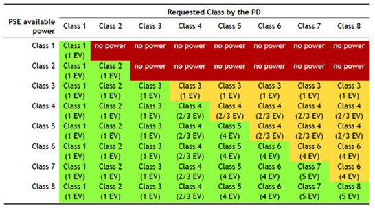 Результирующая таблица событий для определения класса PSE устройством на этапе классификации в зависимости от мощности (класса), которую может выдать PSE устройство и которую запрашивает для себя PD устройство: